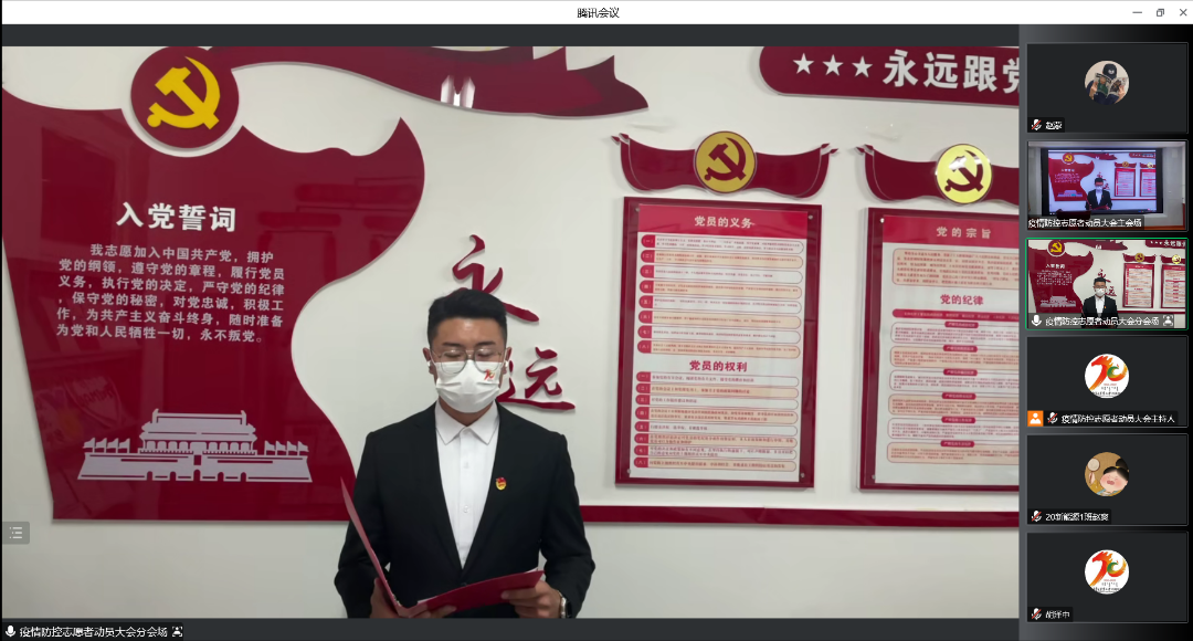 同时,常书记还强调:公司的全体员工党员要冲锋在前,充分发挥模范带头作用,真正做到每一名党员就是一面旗帜。党支部要发挥战斗堡垒作用,哪里有需要哪里就有公司的党员志愿者,哪里就有坚强战斗的党组织。众手高擎党旗红,我们共同努力,让党旗在疫情防控中高高飘扬!公司的共青团组织和广大团员青年、员工干部要发扬“党有号召、团有行动”的优良传统,发扬奉献、友爱、互助、进步的志愿服务精神,在坚决打赢疫情防控阻击战中听指挥、勇拼搏、见行动,在公司党委统一指挥下,科学、有序参与疫情防控工作。