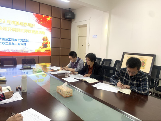 组织生活会结束后新能源工程教工党支部进行了2022年度支部班子和民主评议党员,通过无记名投票的形式对支部委员2022年工作情况进行了民主测评,并推荐支部优秀党员2名。